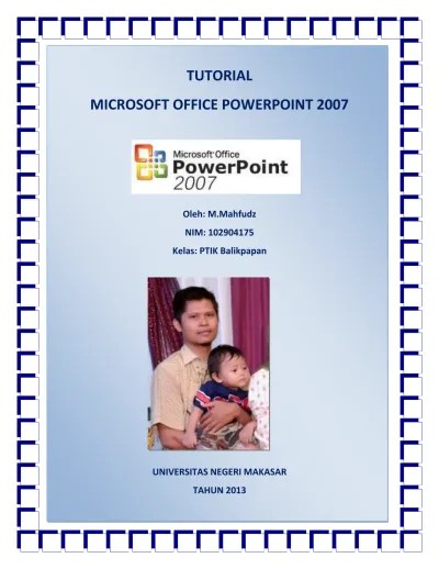Powerpoint 2007 dikenal dengan istilah. Materi awal ( pengenalan membuat presentasi dengan powerpoint 2007 ). Biasanya cukup dikenal dengan nama powerpoint saja. Dalam buku modul ini, bentuk xxxx artinya menekan tombol klik . Slide anda dapat menekan tombol pagedown atau pageup pada keyboard.